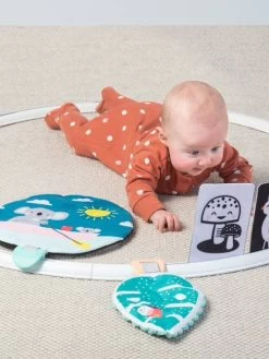 - Contient: 1 miroir arc-en-ciel, 4 cartes en tissu contrasté, 1 hochet anneau de dentition, 1 hochet billes et rubans, 2 cartes colorées, 1 koala bruissant et 1 feuille texturée.