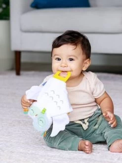 Ce joli coffret comprend un doudou chouette tout doux doté de petits pieds en plastique souple et d’un anneau en silicone à mordiller luminescent pour réconforter bébé la nuit et de deux hochets de dentition multitexturés. Le hochet fleur permet à bébé de soulager ses gencives en mordillant les pétales.