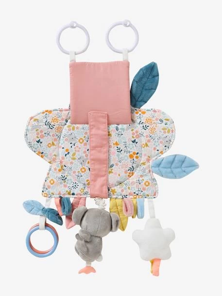 - 3 jouets suspendus : – une fleur avec clochette et rubans, – un koala attaché par un lien vibrant avec une petite feuille, – 2 anneaux plastique colorés et feuilles en velours brodé