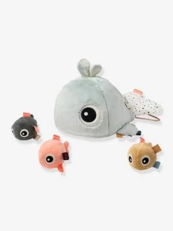 Craquez pour cette adorable baleine Wally, accompagnĂ©e de ses petits amis poissons ! La joyeuse baleine aime jouer Ă cache-cache. DĂ©couvrez comment les petits poissons se cachent Ă l’intĂ©rieur de Wally. Chaque poisson Ă©met un son diffĂ©rent : une clochette, un bruit de papier et un carillon encourageront les petits Ă ramper derrière eux. Laissez votre petit bout dĂ©couvrir les petits poissons, les diffĂ©rentes textures de la baleine ainsi que le miroir cachĂ© sur sa nageoire. Les Ă©tiquettes colorĂ©es et le jet d’eau seront Ă©galement de belles surprises ! Ce jouet d’Ă©veil va bien amuser les petits tout en dĂ©veloppant leur concentration et leur coordination Ĺ“il-main.Â