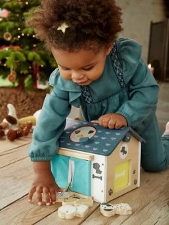 Une niche avec 6 ouvertures que l’enfant devra ouvrir pour ensuite y insĂ©rer un petit chien. Chaque ouverture propose un système diffĂ©rent : ouverture Ă pousser, Ă tirer, Ă boutonner, Ă clĂ©… de quoi dĂ©velopper leur motricitĂ© fine en s’amusant !