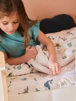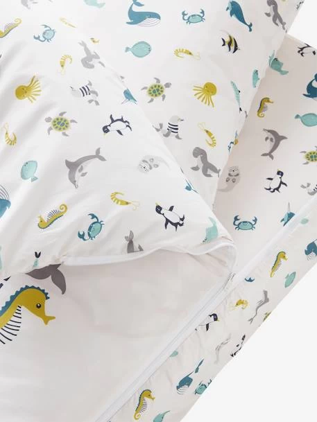 Une parure astucieuse, imprimée de motifs rigolos sur le thème des animaux marins, qui les aide à se border facilement en un tour de zip ! Placez le drap-housse sur le matelas, la housse de couette s’y attache par un zip. Placez votre couette (non fournie) dans la housse. Il suffit à l’enfant de tirer le zip pour être bien bordé. La taie d’oreiller est fournie !