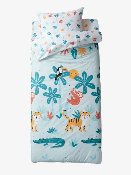 Ludique et pratique, cet ensemble prêt-à-dormir sans couette à l’imprimé jungle ! Les enfants apprennent à faire leur lit tout seul ! Placez le drap-housse sur le matelas, la housse de couette s’y attache par un zip. Placez votre couette (non fournie) dans la housse. Il suffit à l’enfant de tirer le zip pour être bien bordé. La taie d’oreiller est fournie !