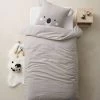 - Motifs licornes sur le devant de la housse de couette et imprimés petites licornes et étoiles sur la taie d’oreiller et le dos de la housse de couette.