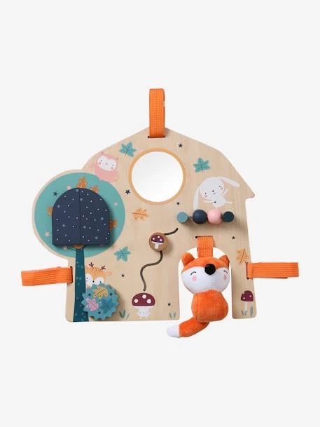 - Sur la planche : 1 petit renard tissu accroché par un lien, 1 petit engrenage, 1 arbre avec fenêtre à ouvrir qui cache un petit écureuil, 1 miroir, 1 mini boulier et 1 champignon à promener le long d’une fente