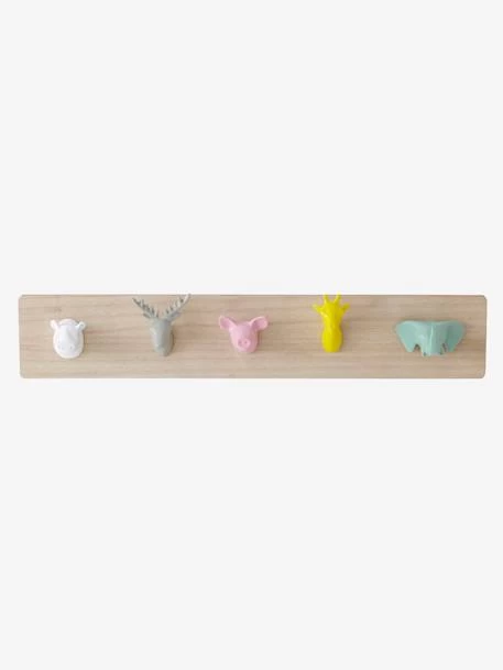 Porte-manteau enfant composĂ© d’une plaque de bois et d’animaux en rĂ©sine.