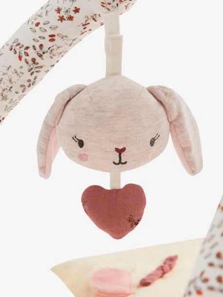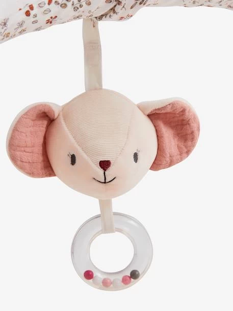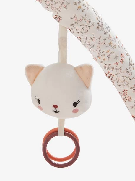 - Sur les arches : 3 jouets suspendus : un chat avec 2 anneaux en plastique colorés, une souris avec anneau en plastique transparent et billes colorées, 1 lapin « pouet pouet » avec un cœur