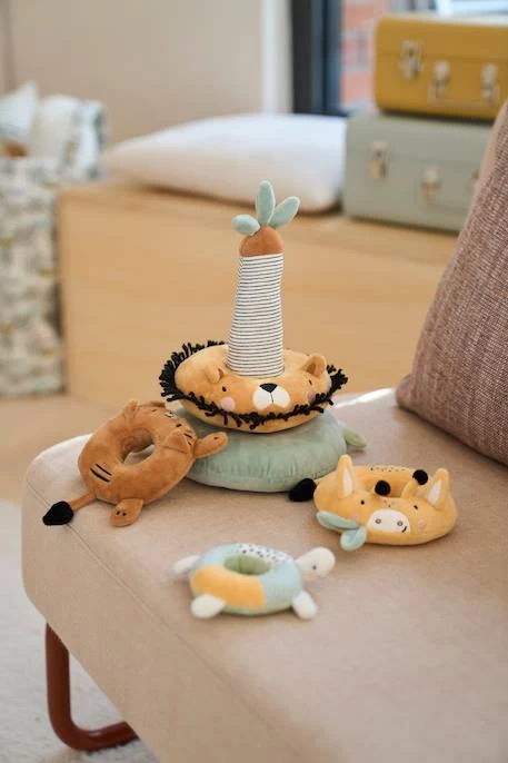 - 4 anneaux animaux de tailles différentes à empiler : un lion, une girafe, un tigre et une tortue
